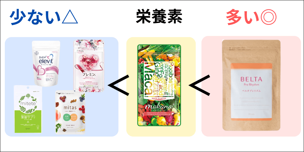 マカ:30mg以上配合を◎、配合を⚪︎、配合なしを△とする